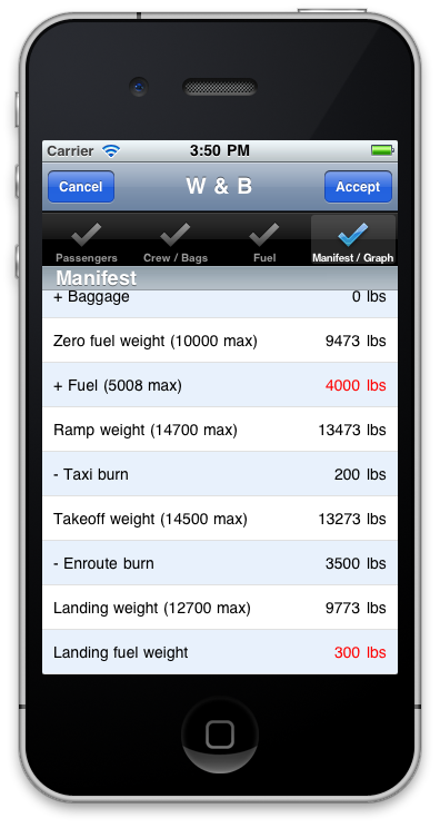 An international runway database is contained within the application, which allows the user to simply select the airport and runway desired.  If internet connectivity is available, real time weather automatically integrates into the calculation. The Net Takeoff Flight Path profile is used to calculate obstacle clearance weight restrictions.  EFB-Pro meets all FAA, EASA and JAR requirements for aircraft performance and weight & balance.